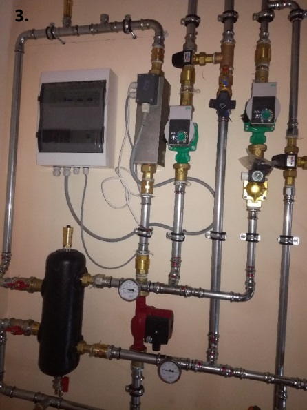 Kleine Wohnung (94 m2) mit 8-kW-Heizung. Die 8-kW-Heizanlage ist platzsparend über einen Heizkörper an das bestehende System angeschlossen. Schlammabscheider und Durchflussschalter sind gut sichtbar.