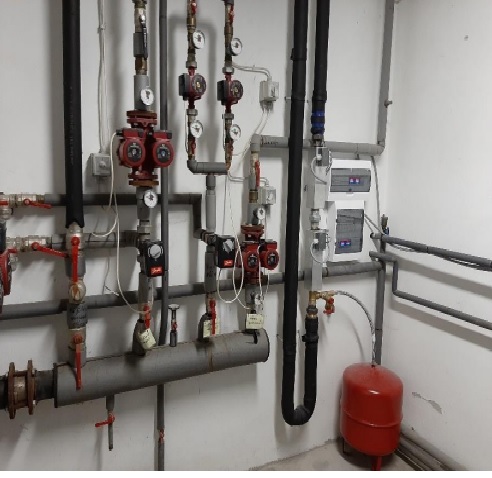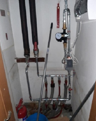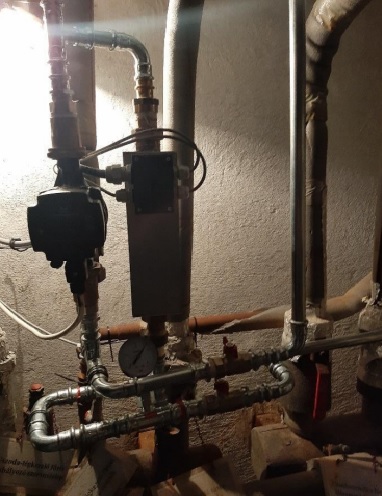Kleine Wohnung (94 m2) mit 8-kW-Heizung. Die 8-kW-Heizanlage ist platzsparend über einen Heizkörper an das bestehende System angeschlossen. Schlammabscheider und Durchflussschalter sind gut sichtbar.